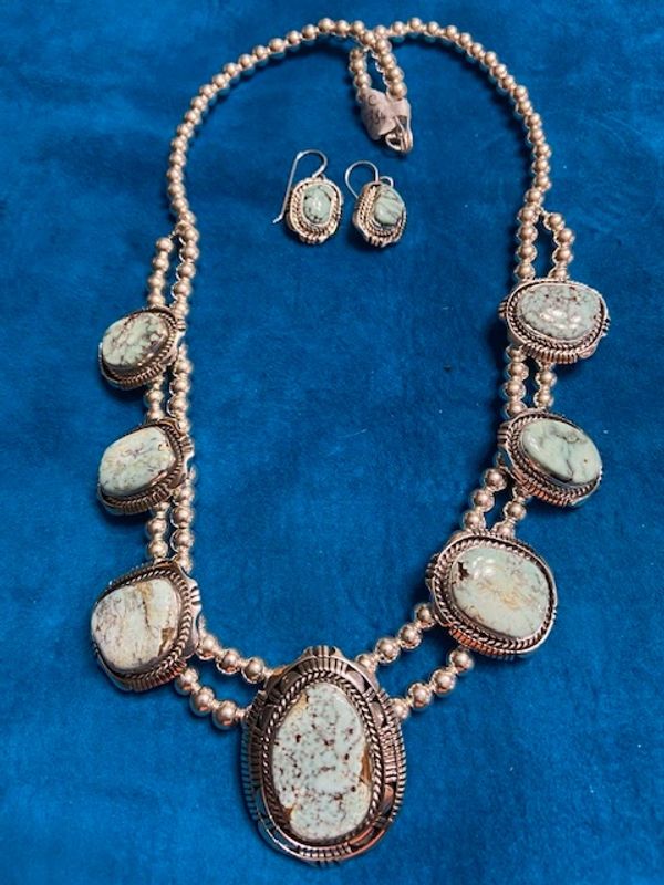 This great piece consists of sterling silver settings strung on silver beads. The stones are light blue Dry Creek Turquoise. Matching earrings complete the set.