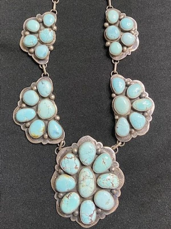 This extra large Dry Creek Necklace is especially nice. It is made up of sterling silver and the coveted sky blue stones from the Dry Creek Mine that was in Battle Mountain, Nevada.